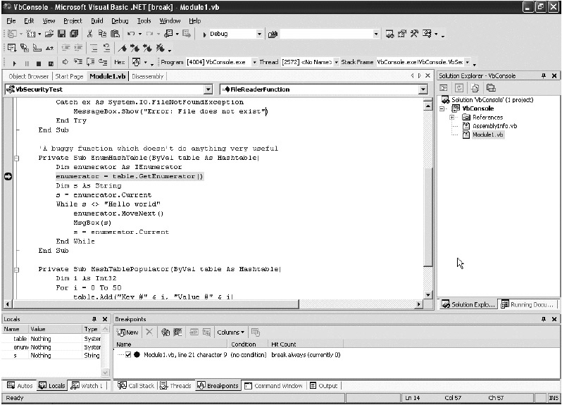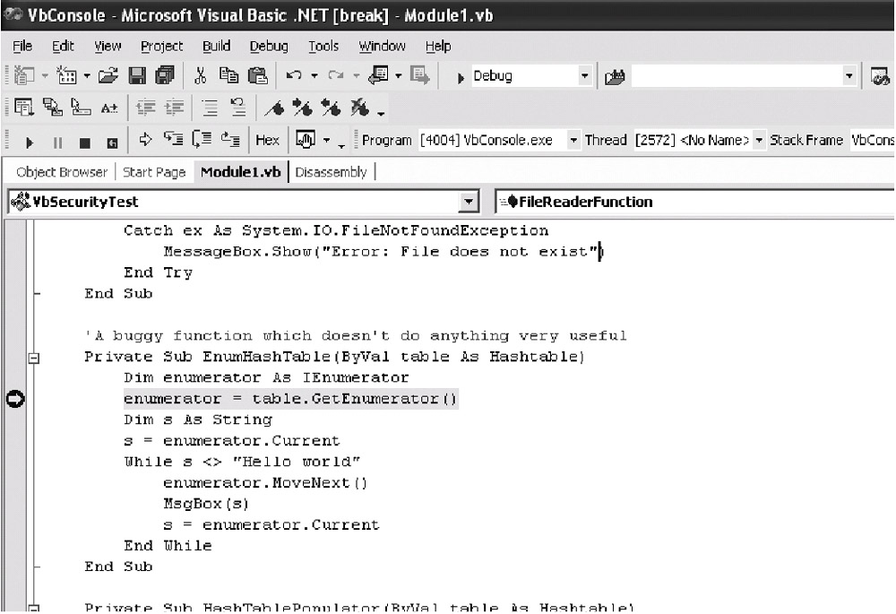 In fact, you can even debug across languages seamlessly, too. Set a breakpoint on the C++ code where you are about to invoke the C# object. Step into the C# method call just as you would for any regular function, and the debugger magically takes you to the right code exactly as if you'd been debugging C# all along (see Figure 1-1). If that method calls one of the VB.NET methods, then the debugger will take you there, too. Debugging cross-language programs was possible before .NET, but it was never easy. But now, cross-language debugging is simple enough to become routine.