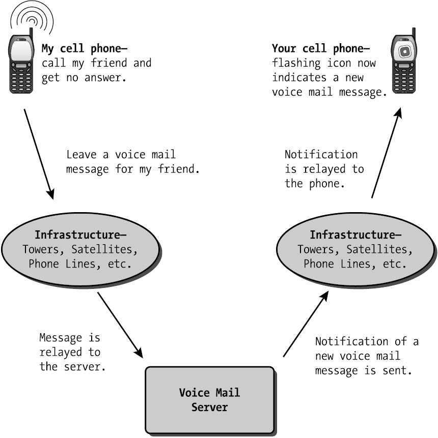 What else must logically exist somewhere in the system? Well, my phone has an icon that changes colors depending on whether I have messages in my voice mail inbox. Some part of the server must be responsible for notifying my phone to change the icon. Who knows what the implementation details are? Maybe my phone pings the server every few minutes to ask if there are any new messages. Or maybe the server sends a message to my phone telling it to switch the color of the icon whenever a new message comes in. Either way, this notification functionality has to be handled somewhere. Let's call the component that does this the notification object.