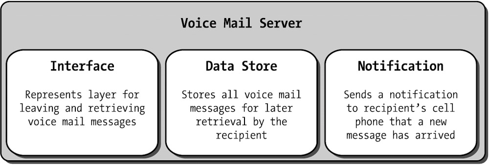 And finally, there is some kind of interface around the data store component to provide routing, security, database querying, etc. When I leave a message for Sally, the message goes in her mailbox, not Harry's. There's security there, too: Some component of the server ensures that only the person calling from Sally's phone can hear her messages. When Harry calls the server, he automatically gets only the messages in his mailbox. And there's a nice little spoken interface on top of each mailbox—"Press 1 to delete this message, 2 to repeat the message," etc. So we're not dealing with raw SQL queries against a database; there's a layer of abstraction to hide the details. All of that functionality has to be handled somewhere, and let's call it the interface component.