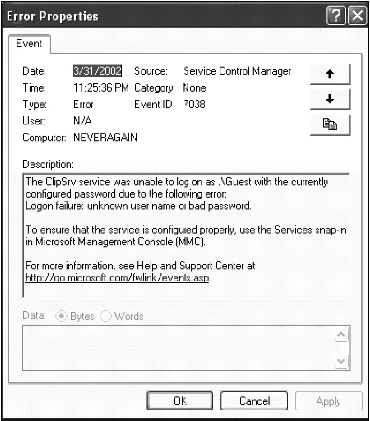 Windows itself writes to the event logs heavily, and for debugging certain types of errors, those event messages are worth their weight in gold. If your program is a Windows service, the event logs are especially useful because they're the easiest way to see why your service failed to start (see Figure 5-2). That's a common and annoying problem because it usually has nothing to do with your code; rather the user did something silly like change the password of the account that runs the service. Even though the problem isn't in your code, customers will still call, asking you to fix the problem. Asking for the customer's event logs will give you the clues you need to solve the issue.