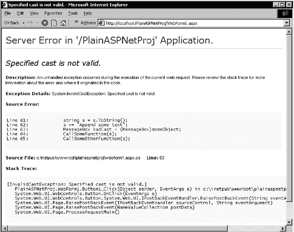 The first debugging improvement most developers notice is the quality of error messages when a bug does happen. With ASP, we got "A runtime error occurred" message boxes, and maybe a line number if we were lucky. But in ASP.NET, we get wonderfully detailed reports about exactly what went wrong, as shown in Figure 6-1.