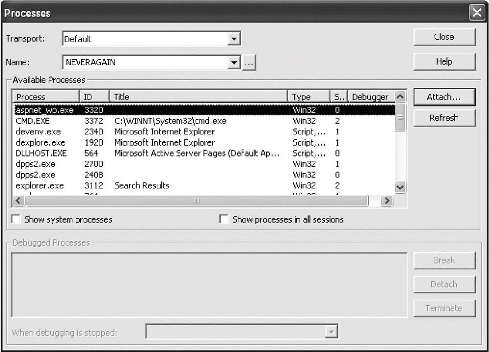 To attach the debugger to a running process, go to the Debug menu and select Processes. You should see a list of all the debuggable processes (see Figure 6-2), so just select the one you want and press the Attach button. In the case of ASP.NET pages, the process you want is called aspnet_wp.exe.