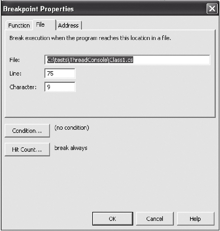 To set a conditional breakpoint, first set a regular breakpoint on the line you want. Then go to the Debug menu item, select Windows, then Breakpoints. Highlight the breakpoint you just set, right-click and select Properties. Finally, you'll see the dialog box displayed in Figure 8-2. Use the Condition and Hit count buttons to make your conditional breakpoint behave the way you want.