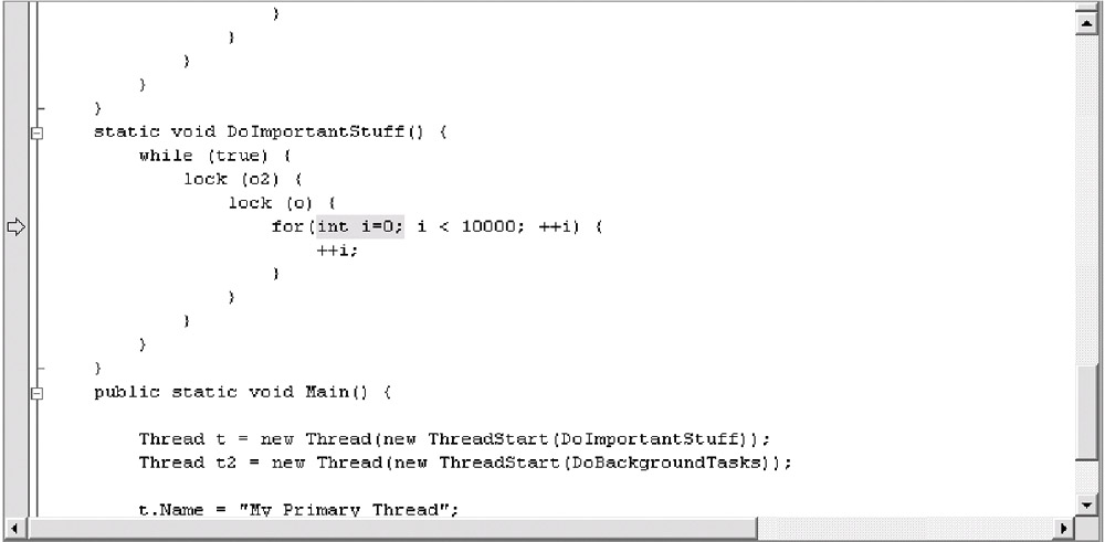 A bug in VS.NET makes this harder than it should be. When a thread is waiting on a lock, the VS .NET debugger may indicate the thread is actually running the line after the lock statement. Figure 8.4 shows some code that is waiting on a lock, yet the debugger makes it look like the code has already passed that point. By pushing the Step Next button, you can tell whether the code is truly past the lock or not. |