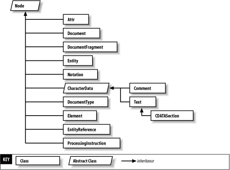 5.1 What Is the DOM?The DOM is an interface for manipulating XML content, structure, and style in an object-oriented fashion. It provides a standardized way of manipulating XML documents, including accessing elements and other nodes, taking actions on an object tree based on events, applying styles to documents, loading documents into object trees and saving object trees to documents, and more. The DOM is language- and platform-neutral, meaning that it can be applied to any programming language on any hardware platform or operating system. Since its start in 1997, the DOM Working Group has made it a specific goal to ensure the DOM's language- and platform-neutrality. They've been successful; you can easily find a DOM implementation in just about any modern programming language, on any modern hardware platform. The DOM represents an XML document as a tree of objects. Each object in the tree is called a node. The types of nodes that the DOM specifies are Document, DocumentFragment, DocumentType, EntityReference, Element, Attr, ProcessingInstruction, Comment, Text, CDATASection, Entity, and Notation. Some of these node types can have subnodes, and the types of subnodes that a particular node type can have are specified. To handle collections of nodes, the DOM also specifies a NodeList object and, for dictionaries of nodes (keyed by their names), the NamedNodeMap object. Figure 5-1 shows the DOM inheritance hierarchy. Figure 5-1. The DOM inheritance hierarchy![]() The DOM specifies a group of interfaces, not actual objects. This means that the implementation of the objects is not mandated, only the methods that must be accessible from a client of the DOM. Because the objects are specified by their interfaces, they cannot be created with traditional constructors; instead, factory methods are commonly used. The DOM also specifies a number of lower-level types, such as DOMString and DOMTimeStamp. These are used internally in the DOM recommendation, but particular language bindings are free to use their own native formats for these types. In C#, these are string and DateTime, respectively. 5.1.1 A Brief Introduction to the DOM SpecificationThe DOM architecture is divided into several modules. Although there is no real meaning to the term, a module of the DOM can be thought of simply as a group of related functionality. The modules as defined by the W3C DOM Working Group are:
