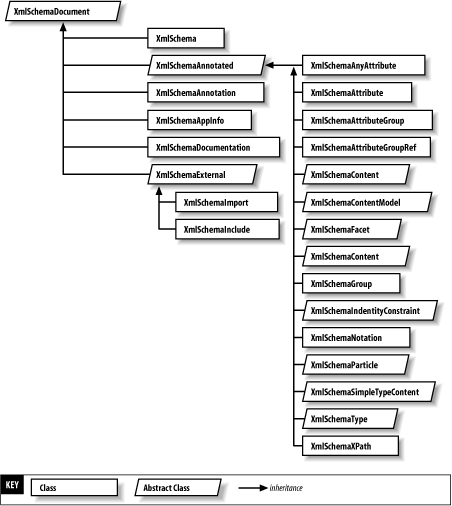 8.3 Working with SchemasBecause the XML Schema language is expressed as an XML vocabulary, it can be dealt with just as any other XML document. XmlReader, XmlWriter, XmlDocument, XPathNavigator, XsltTransform, and the rest of .NET's types can be used to read, write, manipulate, navigate, and transform an XSD document. In addition to the standard ways of dealing with XML documents, however, the System.Xml.XmlSchema assembly includes a host of types that can be used to deal with schema documents in a very XSD-centric way. 8.3.1 Creating a Schema ProgrammaticallyAs you already know, xs:schema is the root element of an XSD document. XmlSchema is the type that represents the xs:schema element. XmlSchema is a subclass of XmlSchemaObject, whose other subclasses are XmlSchemaAnnotated, XmlSchemaAnnotation, XmlSchemaAppInfo, XmlSchemaDocumentation, and XmlSchemaExternal. Each of these subclasses represents a specific type of XML Schema element, and some of them have their own subclasses. The .NET XmlSchema type hierarchy is shown in Figure 8-1. Figure 8-1. XmlSchema type hierarchy![]() Table 8-4 shows each XML Schema element name with its corresponding .NET type. In some cases, more than one .NET class is used for the same XML Schema element; typically, this is the case when the same element has different behavior in different contexts. There are many more types in the System.Xml.Schema assembly that do not correspond directly to an XML Schema element, and they are listed in the assembly reference in Chapter 17.