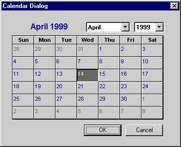 You can add message handlers to the dialog box for Windows controls by right-clicking on the dialog box class in ClassView and choosing Add Windows Message Handler from the context menu, or by right-clicking in the dialog resource in the resource editor and choosing Events from the context menu. You can also use the same procedure to add event handlers for ActiveX controls contained in the dialog box. To see how this is done, let's insert the MS Calendar control in a dialog box and handle an event from it in our derived class. The following steps assume you've already used the Object Wizard to insert a dialog box into your project.