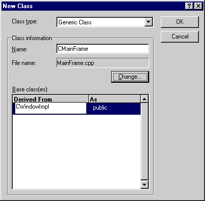 As mentioned, ATL Scribble is going to be an SDI application, so we'll create a frame window using the ATL CFrameWinTraits styles, which we covered in Chapter 14. We'll create a new class derived from CWindowImpl named CMainFrame. There is no wizard support for creating ATL windowing class derivatives specifically, so we'll have to add a generic class with the New Class dialog box and then modify it. Launch the dialog box by right-clicking on the root node in ClassView, and then choose New Class from the context menu. Type in CMainFrame as the class name and CWindowImpl as the base class. Figure 16-1 shows what the fields in the New Class dialog box should contain.