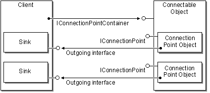 A connectable object is one that supports outgoing interfaces. An outgoing interface allows the object to communicate with a client. For each outgoing interface, the connectable object exposes a connection point. Each outgoing interface is implemented by a client on an object called a sink.