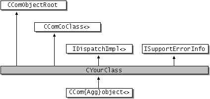 The following illustration depicts the relationship among the various classes and interfaces used in defining an ATL COM object.