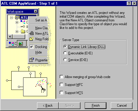 Click OK and the ATL COM AppWizard presents a dialog box offering several choices to configure the initial ATL project.