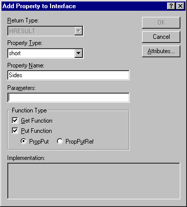 Along with adding the necessary lines to the .idl file, the Add Property to Interface dialog box also adds the Get and Put function prototypes to the class definition in PolyCtl.h and adds an empty implementation to PolyCtl.cpp.