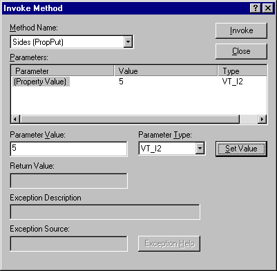 Now rebuild the control and try it again. Open ActiveX Control Test Container and insert the control. You should see a green triangle within a circle. Try changing the number of sides by following the steps below. To modify properties on a dual interface from within Test Container, use Invoke Methods: