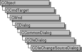 The COleChangeSourceDialog class is used for the OLE Change Source dialog box. Create an object of class COleChangeSourceDialog when you want to call this dialog box. After a COleChangeSourceDialog object has been constructed, you can use the m_cs structure to initialize the values or states of controls in the dialog box. The m_cs structure is of type OLEUICHANGESOURCE. For more information about using this dialog class, see the DoModal member function.