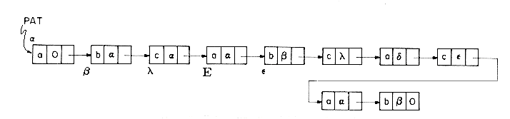 Figure 4.1 shows how some of the nodes of the list we considered before may be represented in memory by using pointers. The elements of the list are stored in a one dimensional array called DATA. But the elements no longer occur in sequential order, BAT before CAT before EAT, etc. Instead we relax this restriction and allow them to appear anywhere in the array and in any order. In order to remind us of the real order, a second array, LINK, is added. The values in this array are pointers to elements in the DATA array. Since the list starts at DATA(8) = BAT, let us set a variable F = 8. LINK(8) has the value 3, which means it points to DATA(3) which contains CAT. The third element of the list is pointed at by LINK(3) which is EAT. By continuing in this way we can list all the words in the proper order.