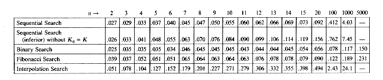The four search procedures sequential, binary, Fibonacci and interpolation search were programmed in Fortran and their performance evaluated on a Cyber 74 computer. The results of this evaluation are presented in table 7.1. Since the input for the last three algorithms is a sorted file, algorithm SEQSRCH was modified to take advantage of this. This was achieved by changing the conditional in the while statement from Ki