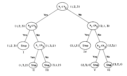 As an example of such a tree, let us look at the tree obtained for Insertion Sort working on a file with three records in it. The input sequence is R1, R2 and R3 so the root of the tree is labeled (1,2,3). Depending on the outcome of the comparison between K1 and K2, this sequence may or may not change. If K2 < K1, then the sequence becomes (2,1,3) otherwise it stays 1,2,3. The full tree resulting from these comparisons is shown below. The leaf nodes are numbered I-VI and are the only points at which the algorithm may terminate. Hence only six permutations of the input sequence are obtainable from this algorithm. Since all six of these are different and 3! = 6, it follows that this algorithm has enough leaves to constitute a valid sorting algorithm for three records. The maximum depth of this tree is 3. The table below gives six different orderings of key values 7, 9, 10 which show that all six permutations are possble. The tree is not a full binary tree of depth 3 and so it has fewer than 23 = 8 leaves. The possible output permutations are: