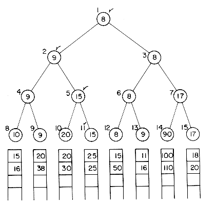 The construction of this selection tree may be compared to the playing of a tournament in which the winner is the record with the smaller key. Then, each nonleaf node in the tree represents the winner of a tournament and the root node represents the overall winner or the smallest key. A leaf node here represents the first record in the corresponding run. Since the records being sorted are generally large, each node will contain only a pointer to the record it represents. Thus, the root node contains a pointer to the first record in run 4. The selection tree may be represented using the sequential allocation scheme for binary trees discussed in section 5.3. The number above each node in figure 8.9 represents the address of the node in this sequential representation. The record pointed to by the root has the smallest key and so may be output. Now, the next record from run 4 enters the selection tree. It has a key value of 15. To restructure the tree, the tournament has to be replayed only along the path from node 11 to the root. Thus, the winner from nodes 10 and 11 is again node 11 (15 < 20). The winner from nodes 4 and 5 is node 4 (9 < 15). The winner from 2 and 3 is node 3 (8 < 9). The new tree is shown in figure 8.10. The tournament is played between sibling nodes and the result put in the parent node. Lemma 5.3 may be used to compute the address of sibling and parent nodes efficiently. After each comparison the next takes place one higher level in the tree. The number of levels in the tree is