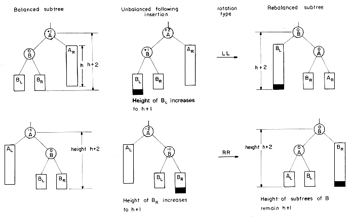 In the preceding example we saw that the addition of a node to a balanced binary search tree could unbalance it. The rebalancing was carried out using essentially four different kinds of rotations LL, RR, LR and RL (figure 9.10 (v), (iii), (vi) and (ix) respectively). LL and RR are symmetric as are LR and RL. These rotations are characterized by the nearest ancestor, A, of the inserted node, Y, whose balance factor becomes