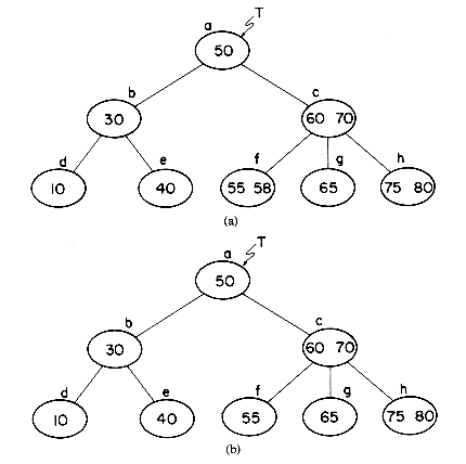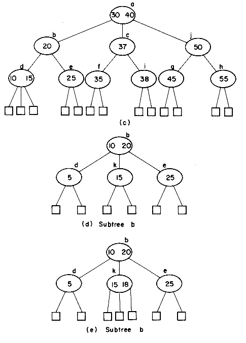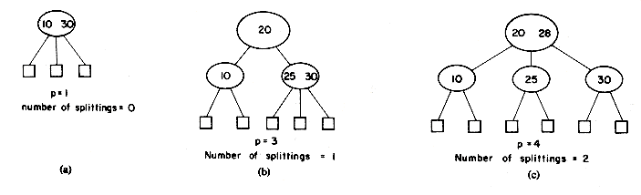 i). In this case a binary search of the node can still be made. The use of variable size nodes is not recommended since this would require a more complex storage management system. More importantly, the use of variable size nodes would result in degraded performance during insertion. For example, insertion of X= 85 intothe 2-3 tree of figure 10.16(e) would require us to request a larger node, j, to accomodate the new value being added to the node h. As a result, node c would also be changed since it contains a pointer to h. This pointer must be changed to j. Consequently, nodes of a fixed size should be used. The size should be such as to allow for at least m - 1 key values of the largest size. During insertions, however, we can relax the requirement that each node have