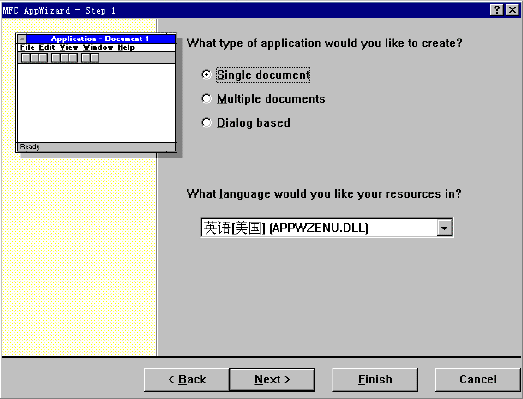 图3.2 MFC AppWizard-Step 1对话框 AppWizard是一个自动化程序生成工具,它通过提示用户一系列对话框,来指定将要生成的应用程序的特性,然后自动生成相应的代码。下面,我们一步一步演示如何用AppWizard生成Hello程序。 1.MFC AppWizard当前显示MFC AppWizard-Step1对话框。在这个对话框中,可以指定生成框架的类型,包括Single Document(单文档),Multiple Document(多文档),Dialog Based(基于对话框)三种。还可以从下拉列表框中选择语言,指定程序资源文件使用的语言类型。选择Single Document,此时AppWizard将生成一个单文档的应用程序框架,也就是说,应用程序运行时是一个单窗口的界面。点击Next按钮。